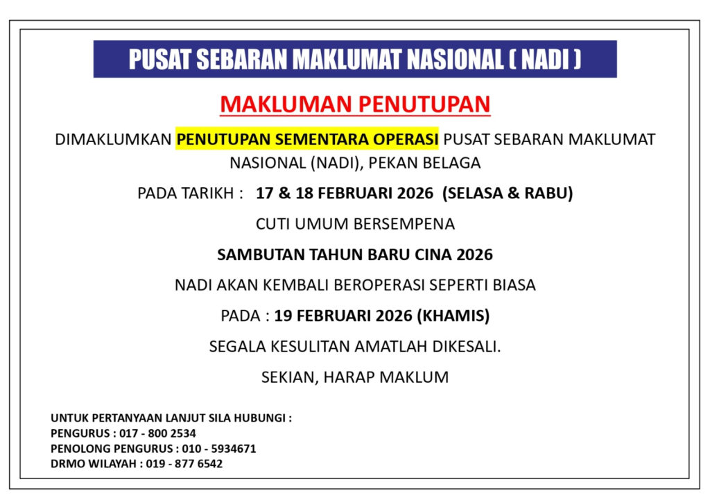 📢 Pemaklumam Penutupan sementara NADI Pekan Belaga bersempena dengan Tahun Baru Cina pada 17 & 18 Februari 2026 (Selasa & Rabu).